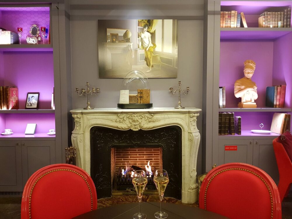 The first thing we are struck by at the luxurious 5 star boutique hotel, La Belle Juliette is the bright, unusual and contrasting colour scheme over soft and plush fabrics. The roaring fire in the decadent lounge creates a warm and welcoming atmosphere and the spot to toast a glass of champagne.