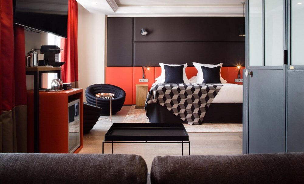 This 4-star chic boutique hotel is nestled within the Latin Quarter – the Notre Dame, Louvre and the Pantheon all within a short walking distance. It has a romantic and luxury feel, decorated with photos of black and white scenes of the streets of Paris by Nicolas Sénégas, a splash of fuchsia pink materials on the chairs, an orange glass ceiling, locally sourced antiques (such as the two oval windows rescued from a grand Parisian residence), mirrors and lanterns hanging each side of the bed.