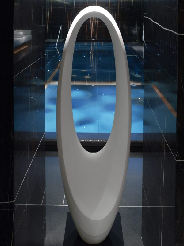 Down another two levels are the wet and thermal facilities. At the entrance there’s a pretty relaxation area which has white leather couches and a statement light piece which looks almost like petals and butterflies.