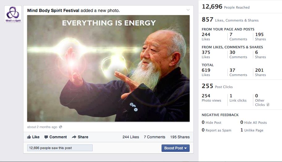 Here’s an example of an inspirational style post that reached on 12,696 people that I created for my client the Mind Body Spirit Festival.