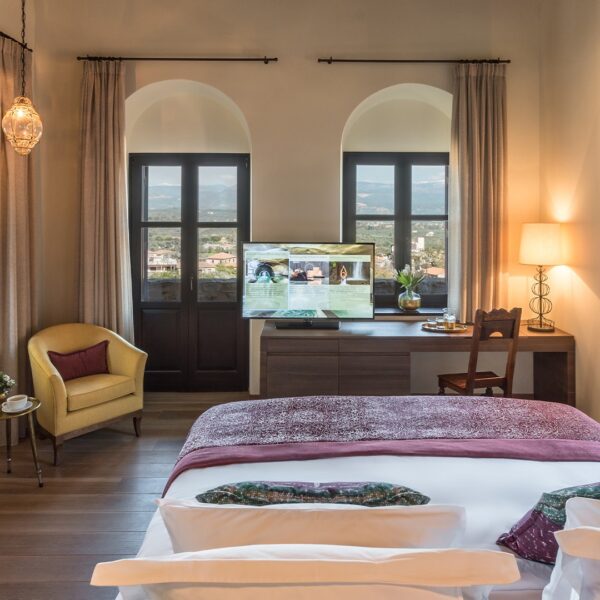 The Superior Deluxe guest rooms boast an area of 35 to 49 square metres. They have an adjoining seating area, marble or wooden floors, a marble bathroom with shower, and a veranda overlooking the citrus groves and the village of Mystras, or the private forest. They come with either twin beds, a small double (130cm) or a super king-size bed and are fully equipped with modern appliances.