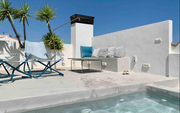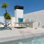 Planted yucca trees cast atmospheric shadows against the whitewashed walls and offer shade for visitors lounging in the poolside chairs.