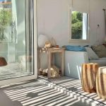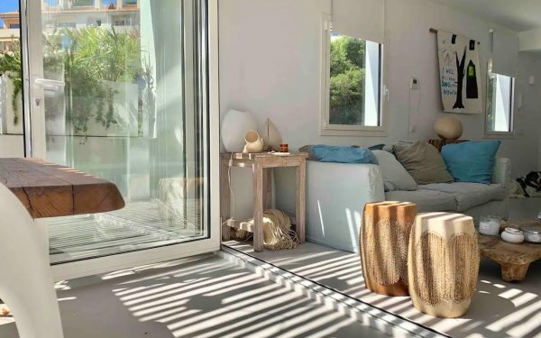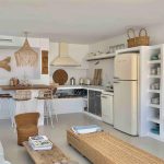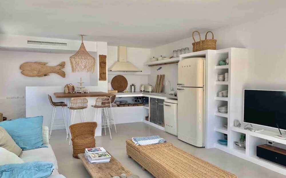The area is shaded making it the perfect spot to chill out during the hottest part of the day. Or head into the living area and soak in the atmosphere, as rattan furnishing and driftwood pieces bring the beach inside, while a soft sofa is a comfy place to quietly reflect on the day.