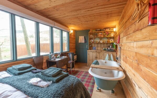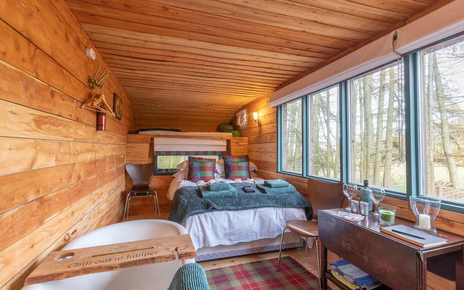 Juniper is hidden away in the Scots pines creating some privacy while allowing glimpses out to the Highlands through the trees. This impressive 7.5 tonne converted Leyland horse lorry now has a beautiful wood-clad interior that sleeps a family of four and even has room for a roll top bath tub.