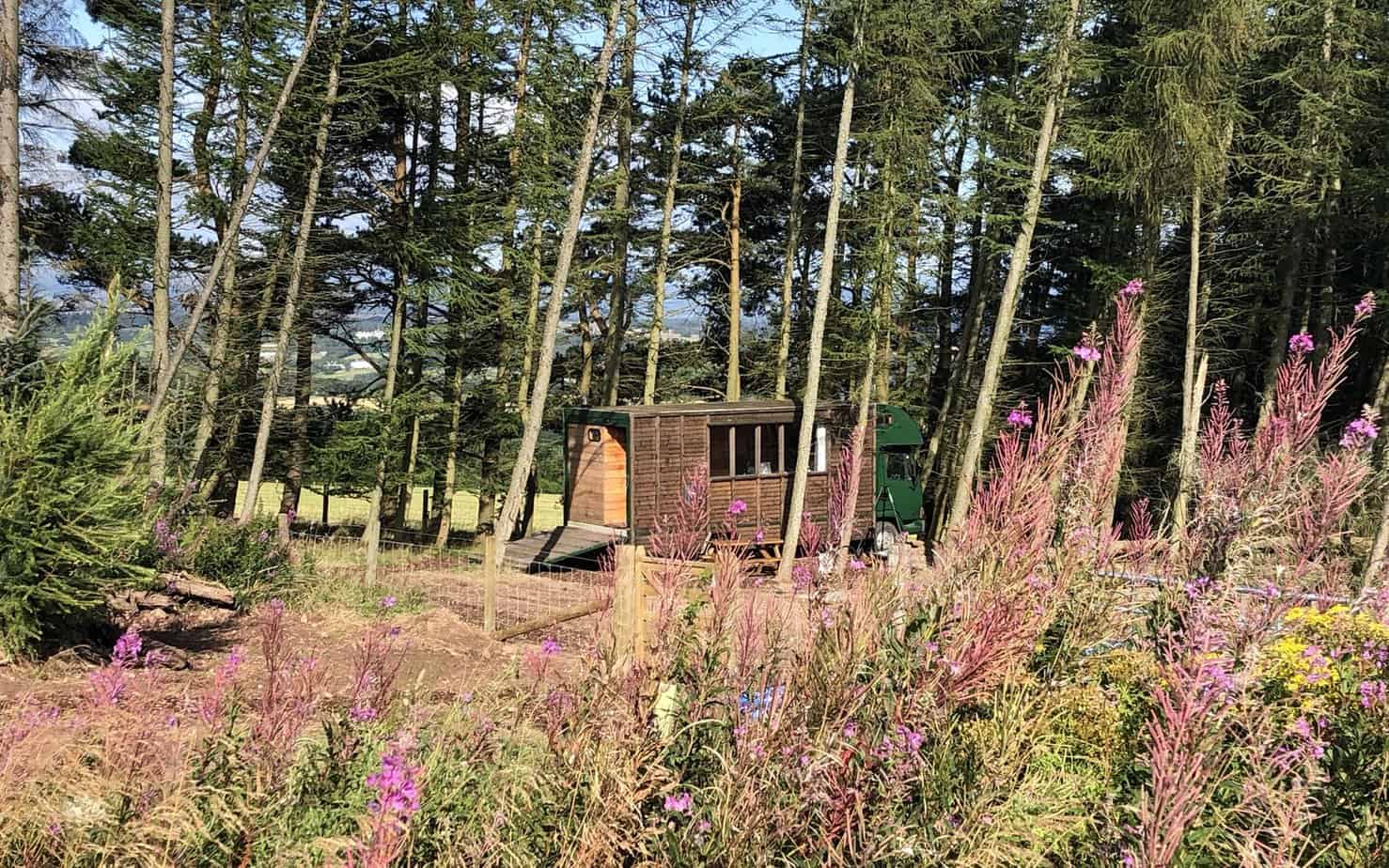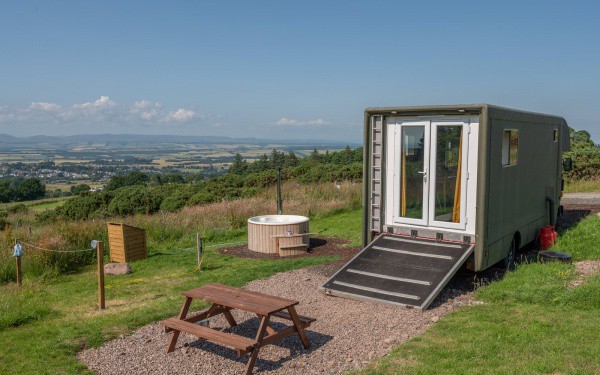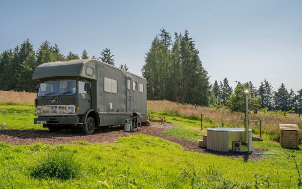 Luxury glamping in converted horse boxes with wood-fired hot tubs in the heart of Scotland, a secluded escape for couples or families.