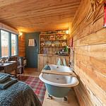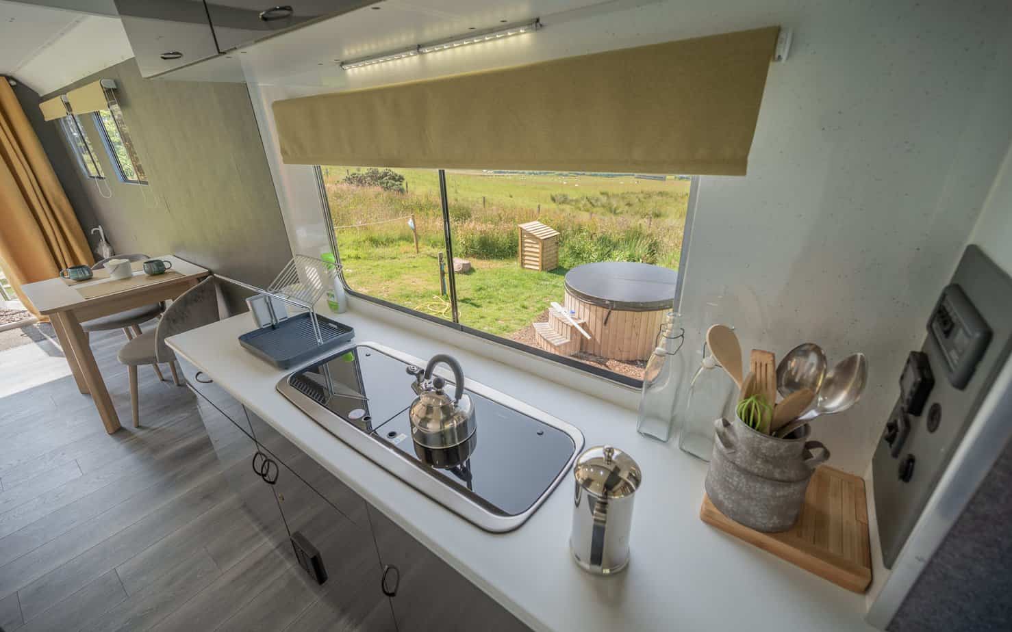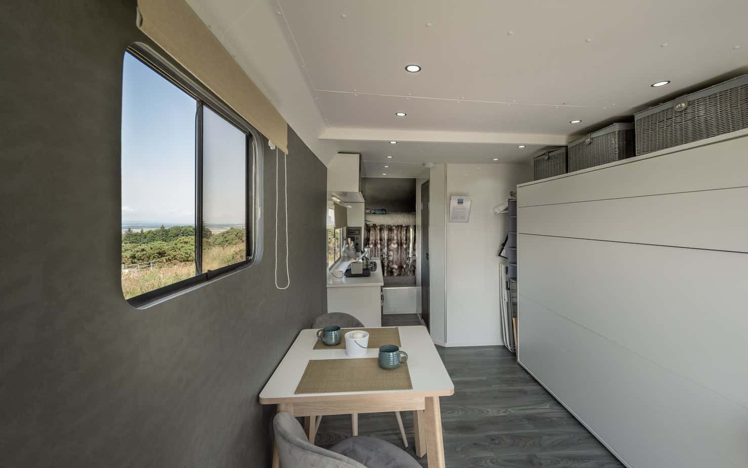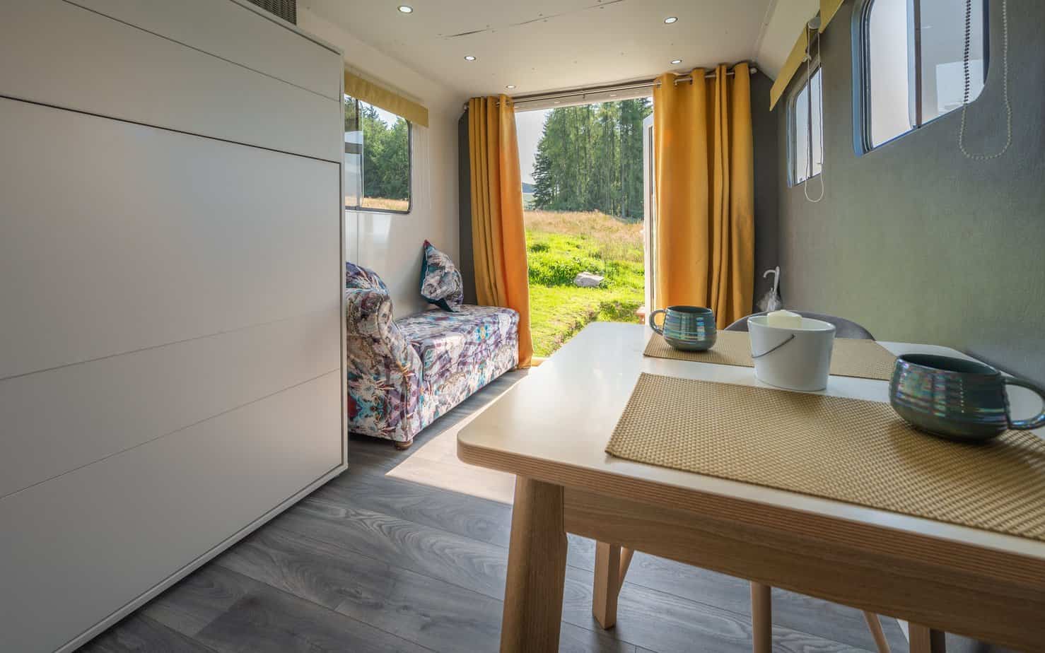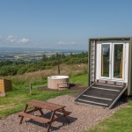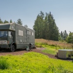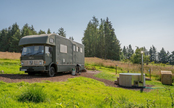 Thistle is set out in the open, all the better to enjoy that spectacular view. The interior of this lorry has a more modern feel with a sleek ensuite shower room and a fold down double bed. The kids’ bed is located above the cab and is therefore suitable for those up to the age of 10. The wood-fired hot tub is perfectly positioned for soaking up the spectacular scenery and there’s also an outdoor dining area.