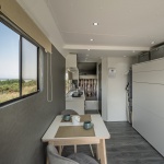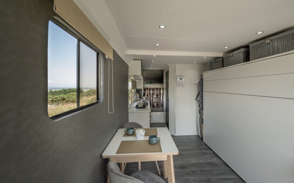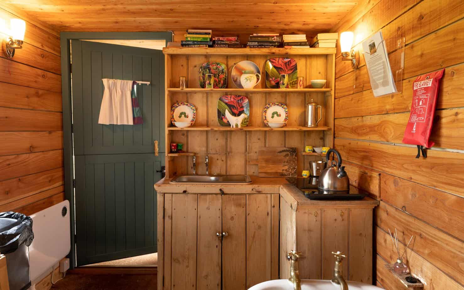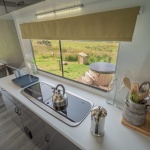There’s a comfy double bed with a sprung mattress, crisp white linen and feather pillows and duvet. The bed for the kids is located in a nook above the lorry cab, creating a cosy space for them. There’s also a kitchenette and an ensuite with a flushing toilet.