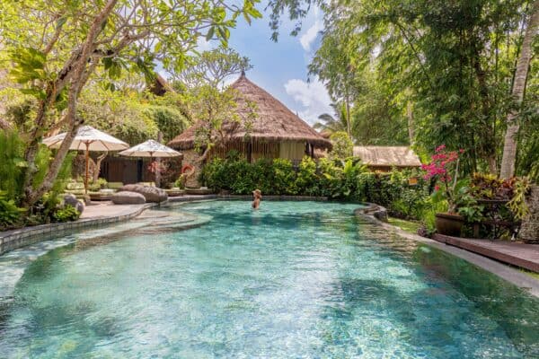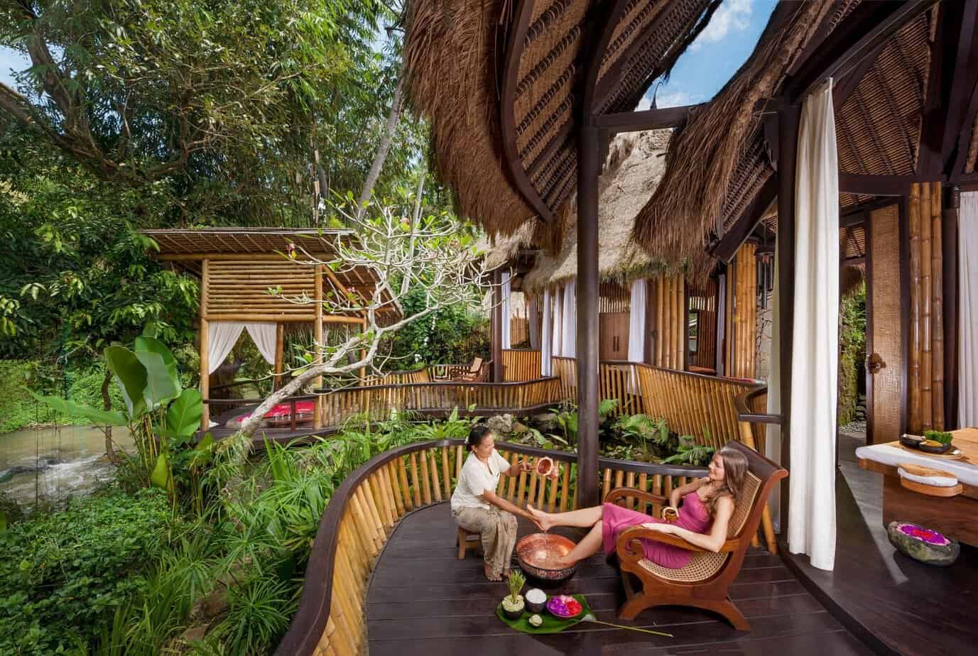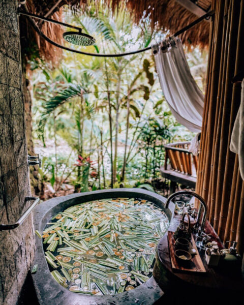 Facing a verdant forest hillside with waterfalls and the natural wonders that are often captured in Balinese paintings, each suite features an open veranda poised above the river’s swirling currents and a private bamboo enclosure housing a large open-air bathtub hewn from a stone boulder. Customised lighting showcases the seven colours of the chakras, bringing mind, body and spirit in unison with nature.