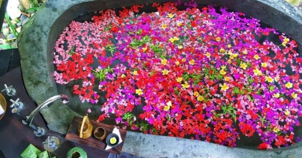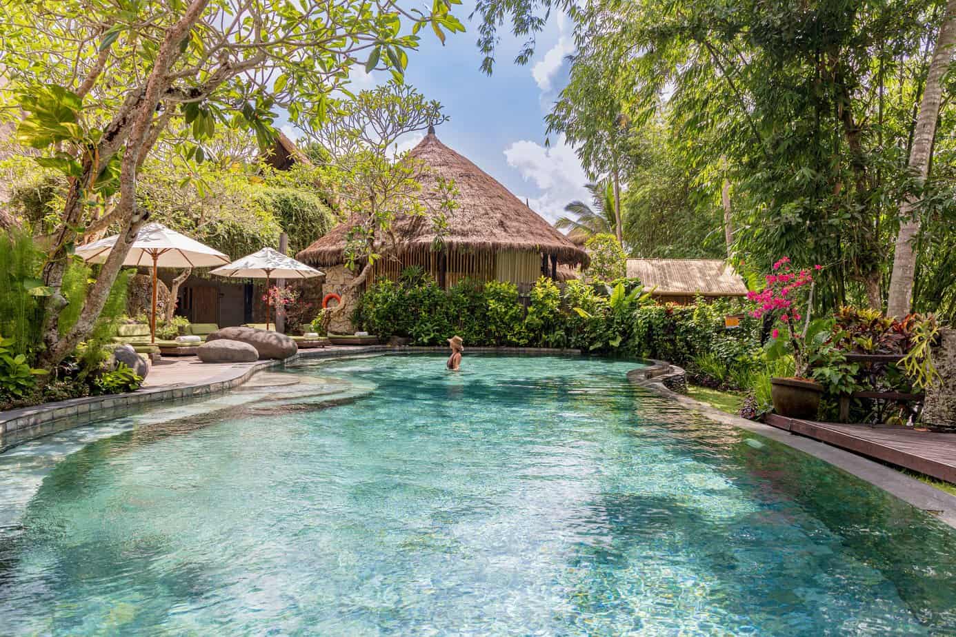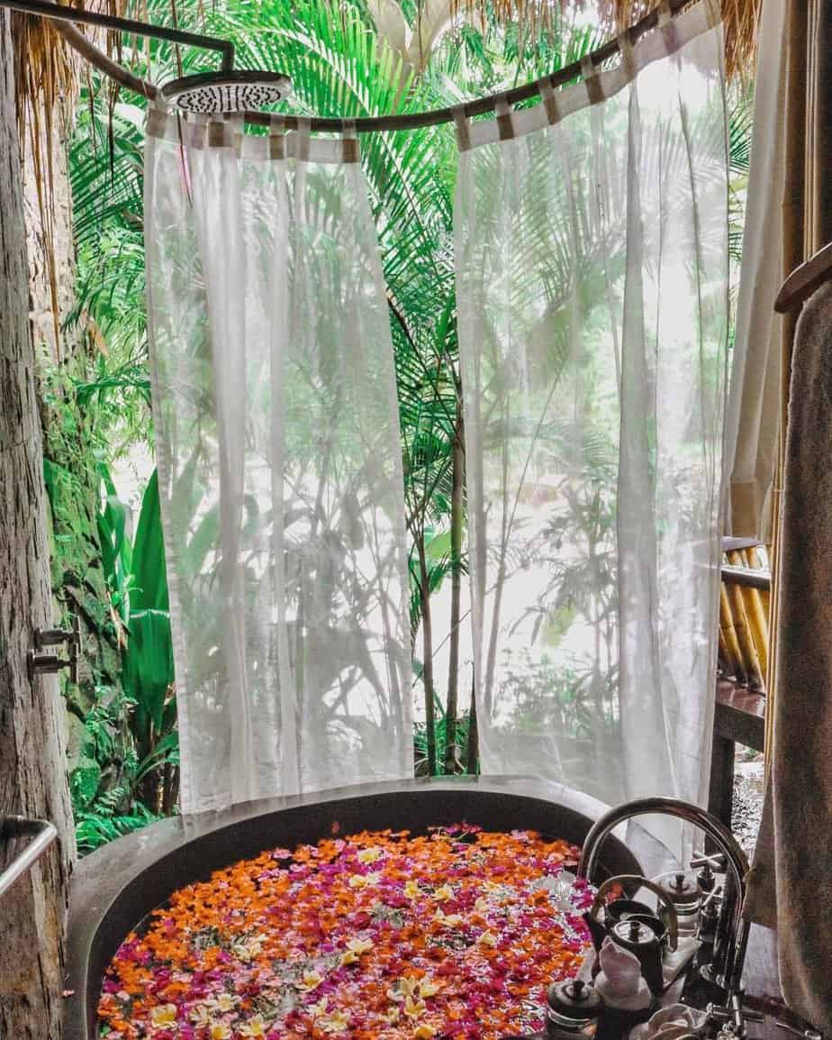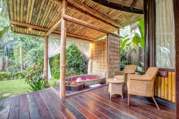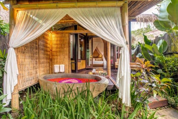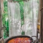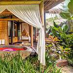 ”I don’t think I’ve ever stayed anywhere as magical as Fivelements. The room blew me away. It’s not everyday you have your own private bath tub next to a river! The room was spacious and luxurious in a simple Balinese way- not over the top. The other end of the room featured a spacious outdoor bathroom I was happy to share with a gecko or two. The grounds themselves were also stunning, sitting along side the river. The vegan food was loving prepared- but I was over it by the end (just not my thing!). All and all highly recommended – especially for honeymooners, as the rooms were very private. Treat yourself!.”