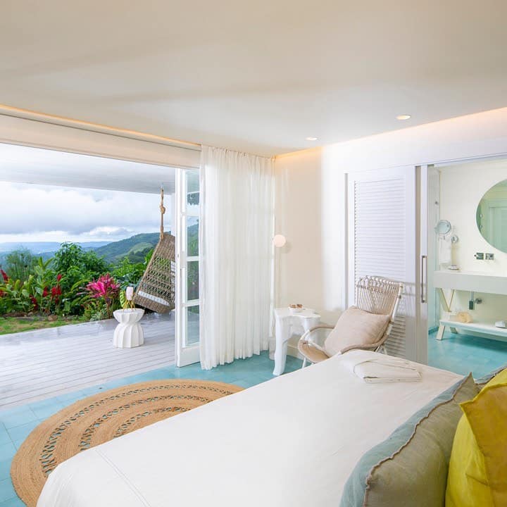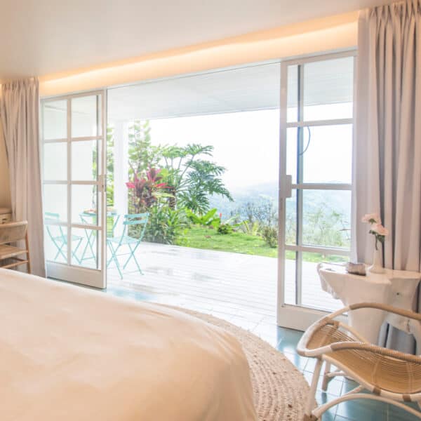 Coco is our King suite situated near the yoga studio with a large covered balcony for enjoying the vast views of the mountain, valley, and ocean.