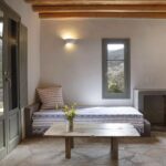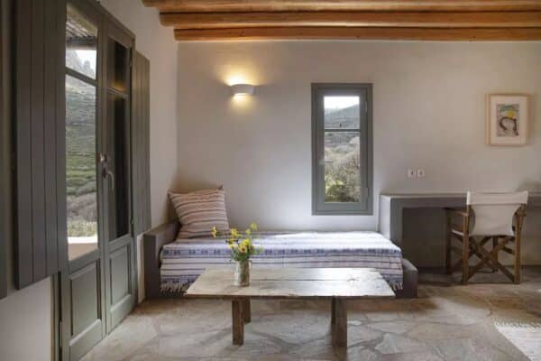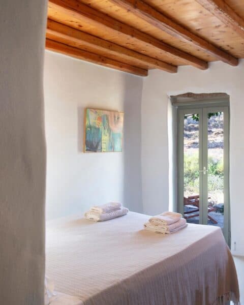 Oak is a a self-contained studio above Olive, with a king-size bed and sofa bed that can accommodate up to 3 people. Wooden shuttered doors open up to a patio shaded by an old oak tree with a lovely view of the hill of Exombourgo and the villages of Xinara and Loutra. Just below is a pigeon house, one of the most characteristic features of Tinos architecture.
