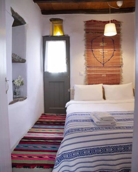 The living room has a sofa bed and a cosy wood burning stove for winter warmth. There’s is a fully equipped kitchen and bathroom. The front patio looks out onto the imposing granite hill of Exombourgo All around are fig trees and old vines from from which we make our barrelled wine and raki.