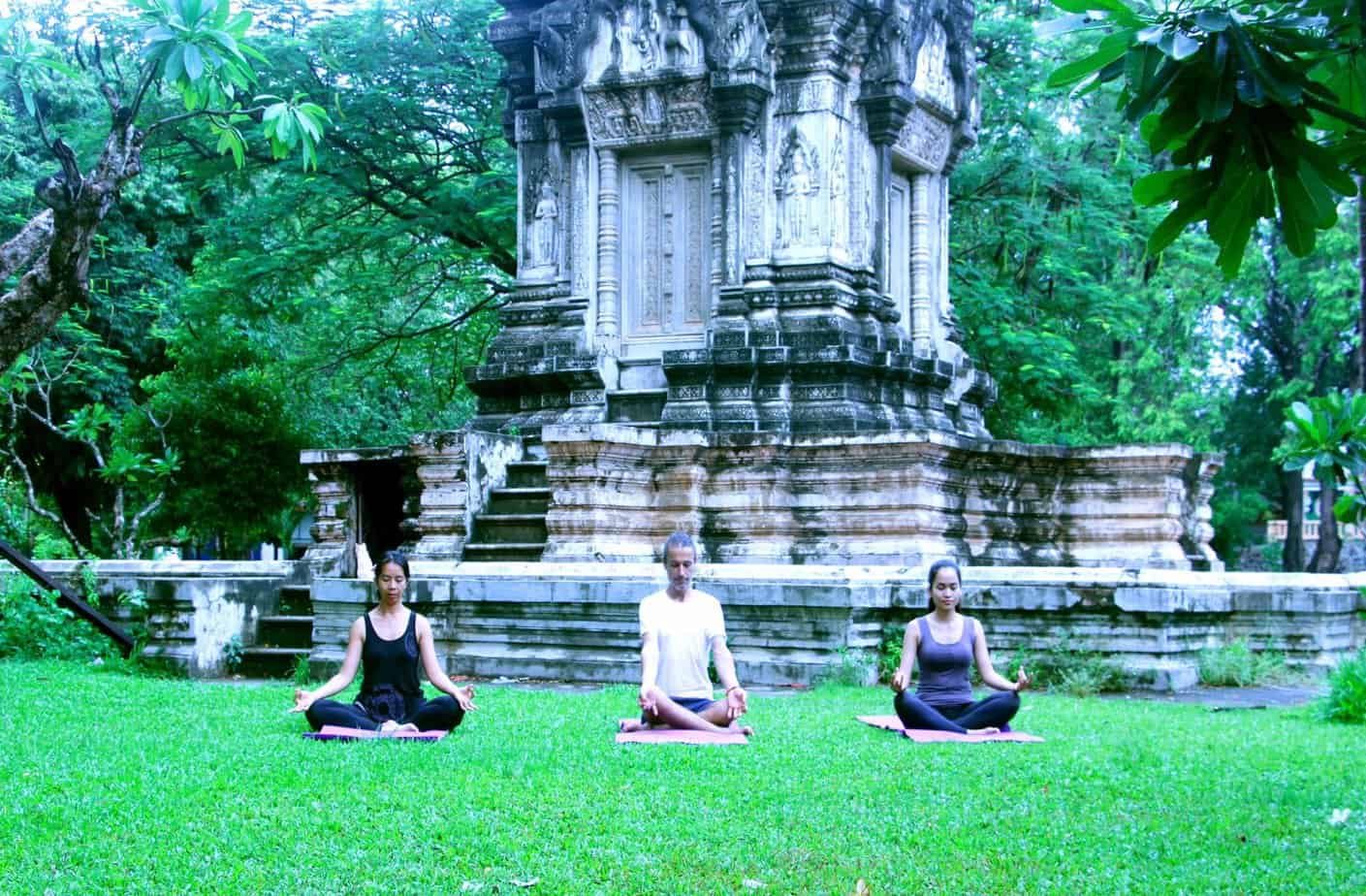 This is a sunrise or early morning private yoga at a local pagoda or at an Angkorian temple.