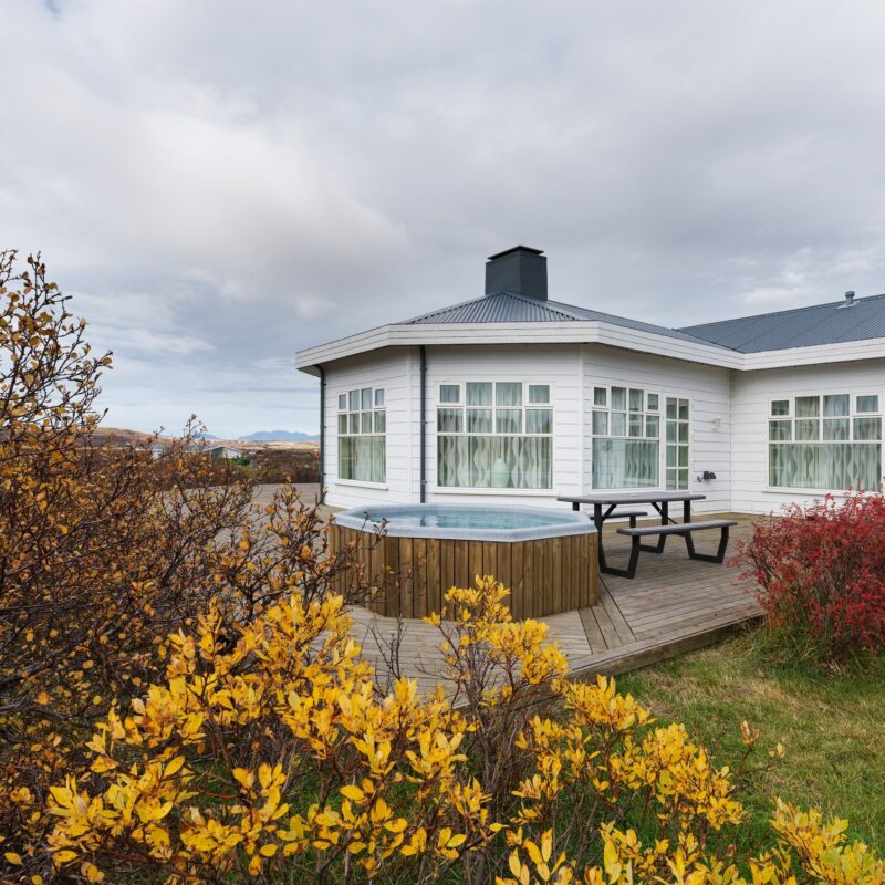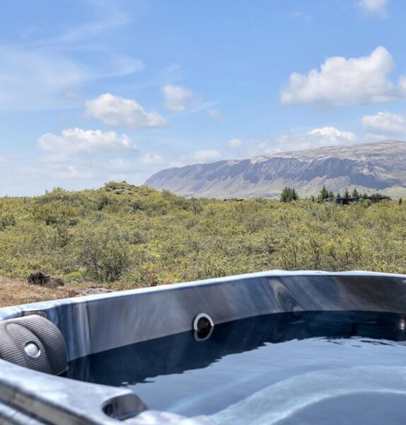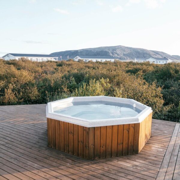 Hotel Grimsborgir is a luxury hotel located 70 km east of Reykjavik in the heart of the Golden Circle, nestled on the bank of river Sogid surrounded by stunning landscape. Some highlights of Icelandic nature, geography and history are within easy reach. All rooms come with balcony or terrace and access to one of 29 geothermal hot tubs on site.