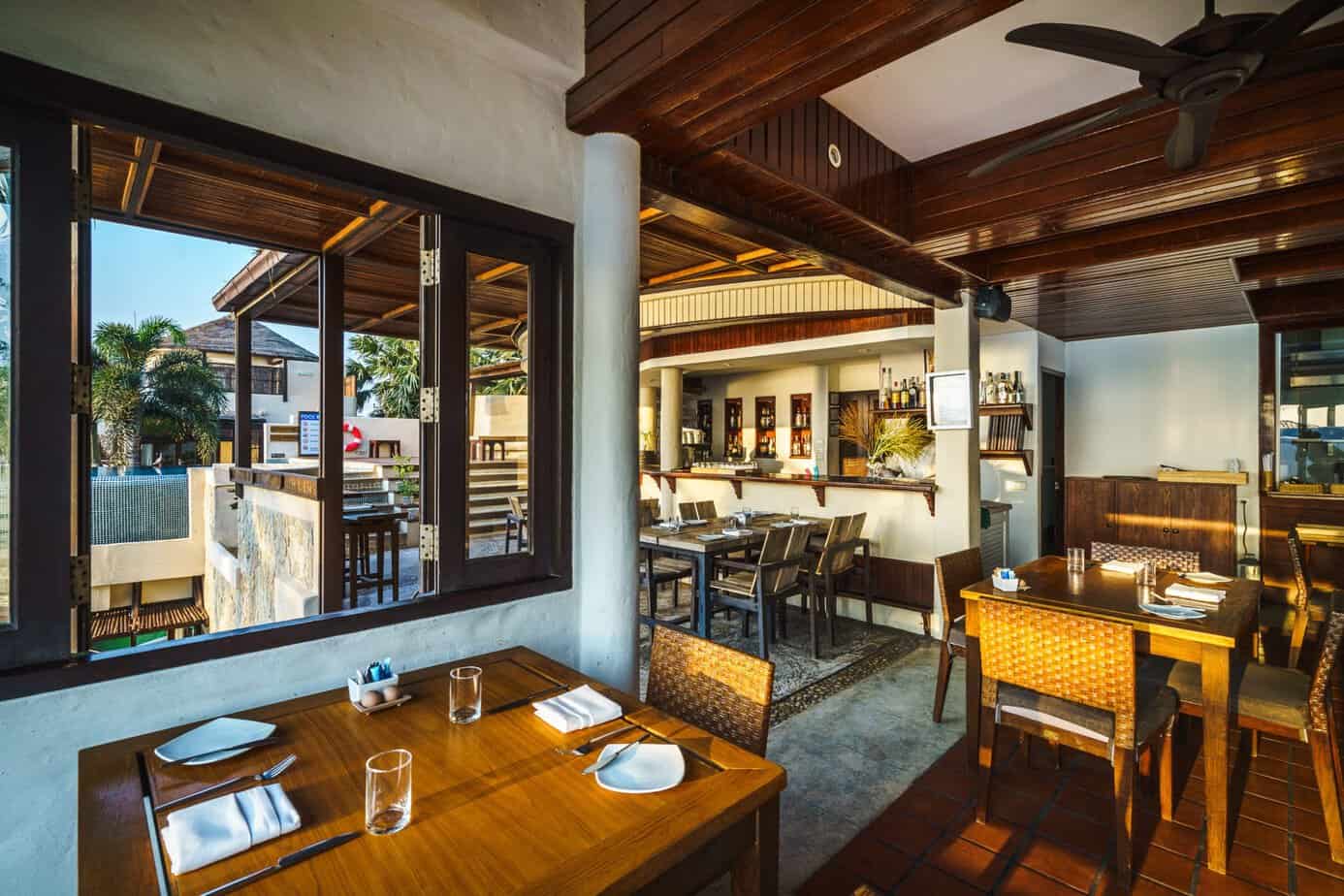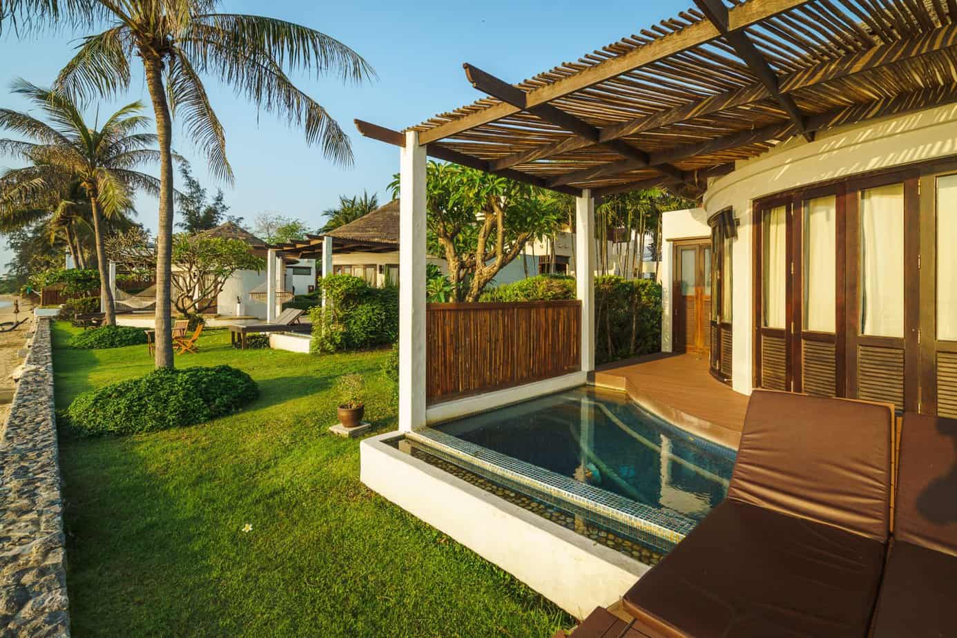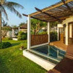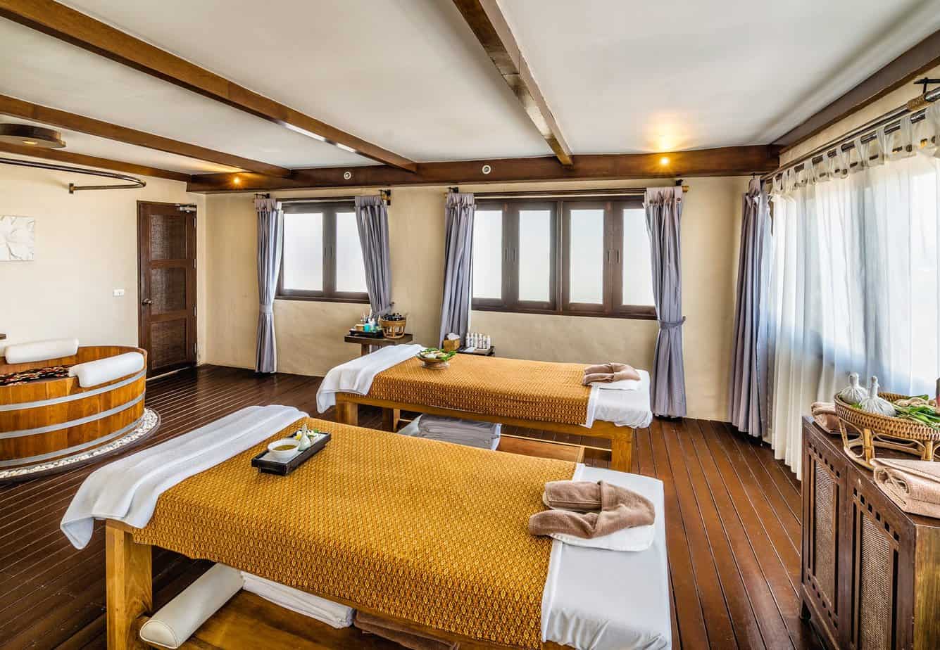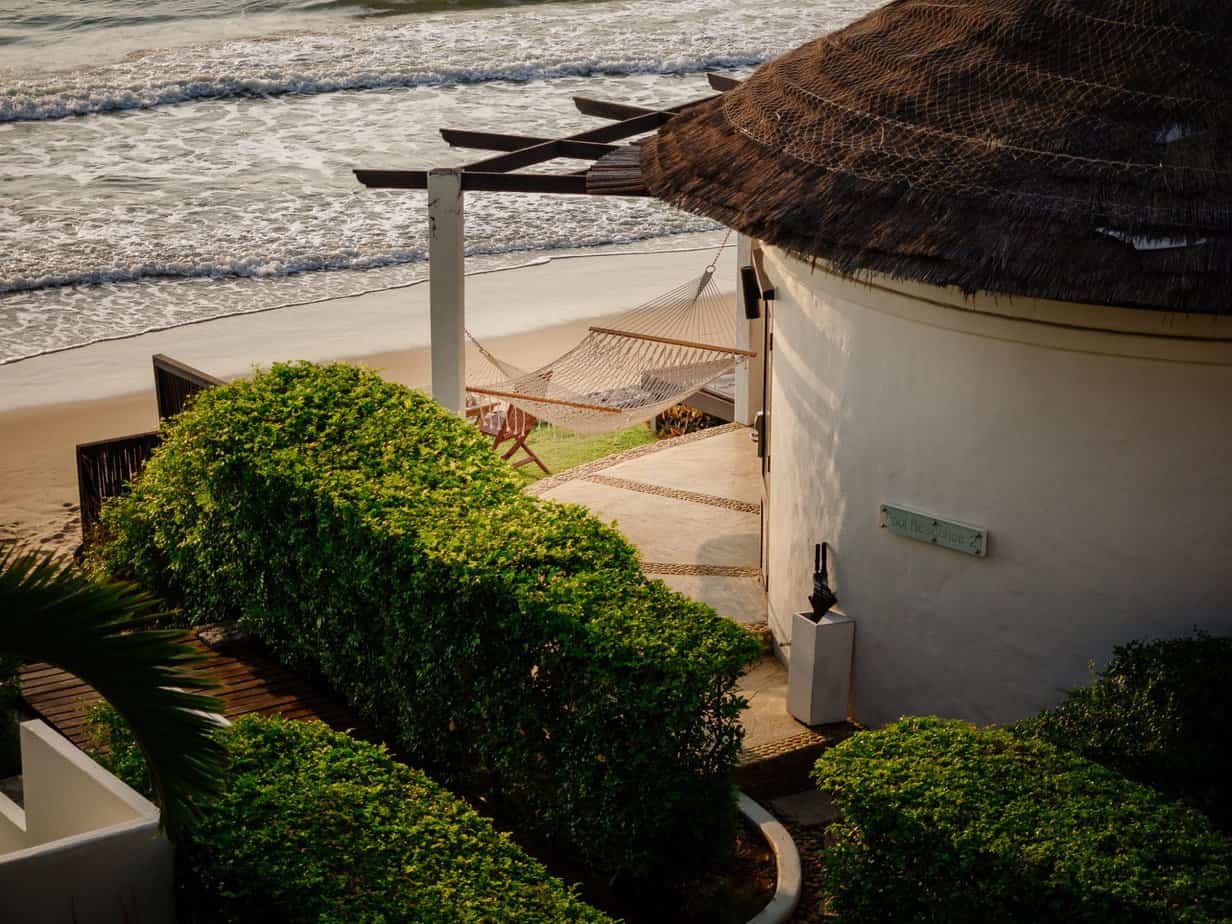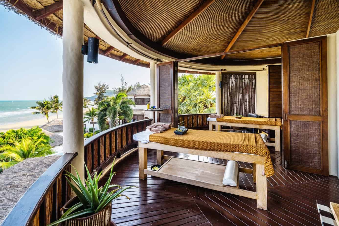 The accommodation at this tranquil Hua Hin Resort & Spa in Pranburi is unique in many ways. The main resort, located along the beachfront, features white-washed buildings with thatched roofs, amid swaying palms.