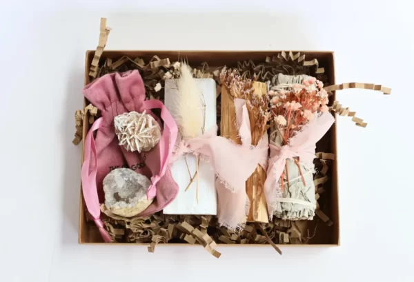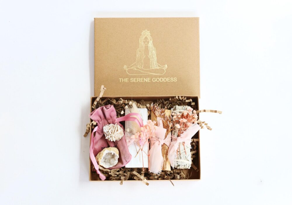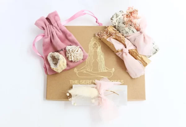 All items are carefully arranged in a recycled kraft box (18 x 14 x 3.9cm), embossed with The Serene Goddess logo, finished with ribbon and floral touches. Includes a printed guide with instructions for using your smudge and crystals.