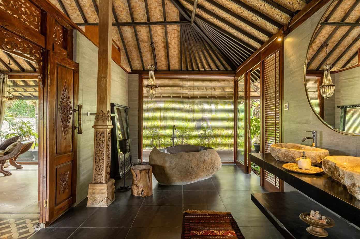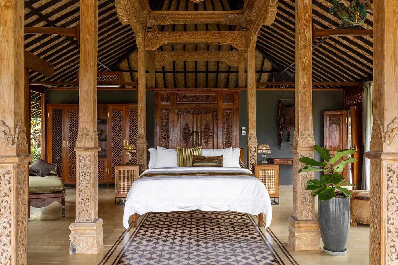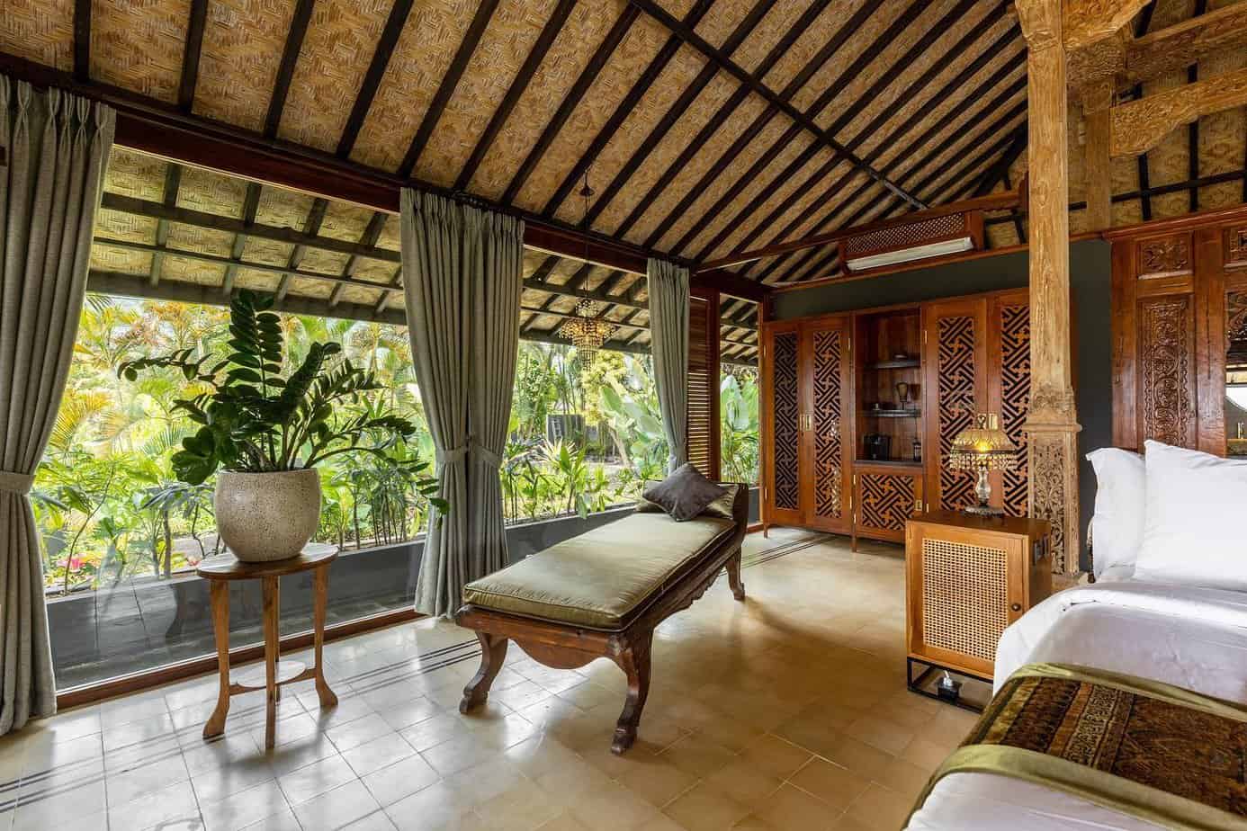 This is Samanvaya’s largest and most luxurious villa with unique Javanese design, living and dining areas, an ensuite with a luxurious natural stone bathtub, and an outdoor area with private pool. The peak of luxury, romance and modern design with views of the rice fields to the ocean.