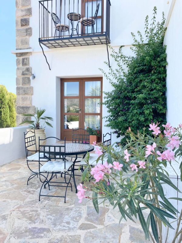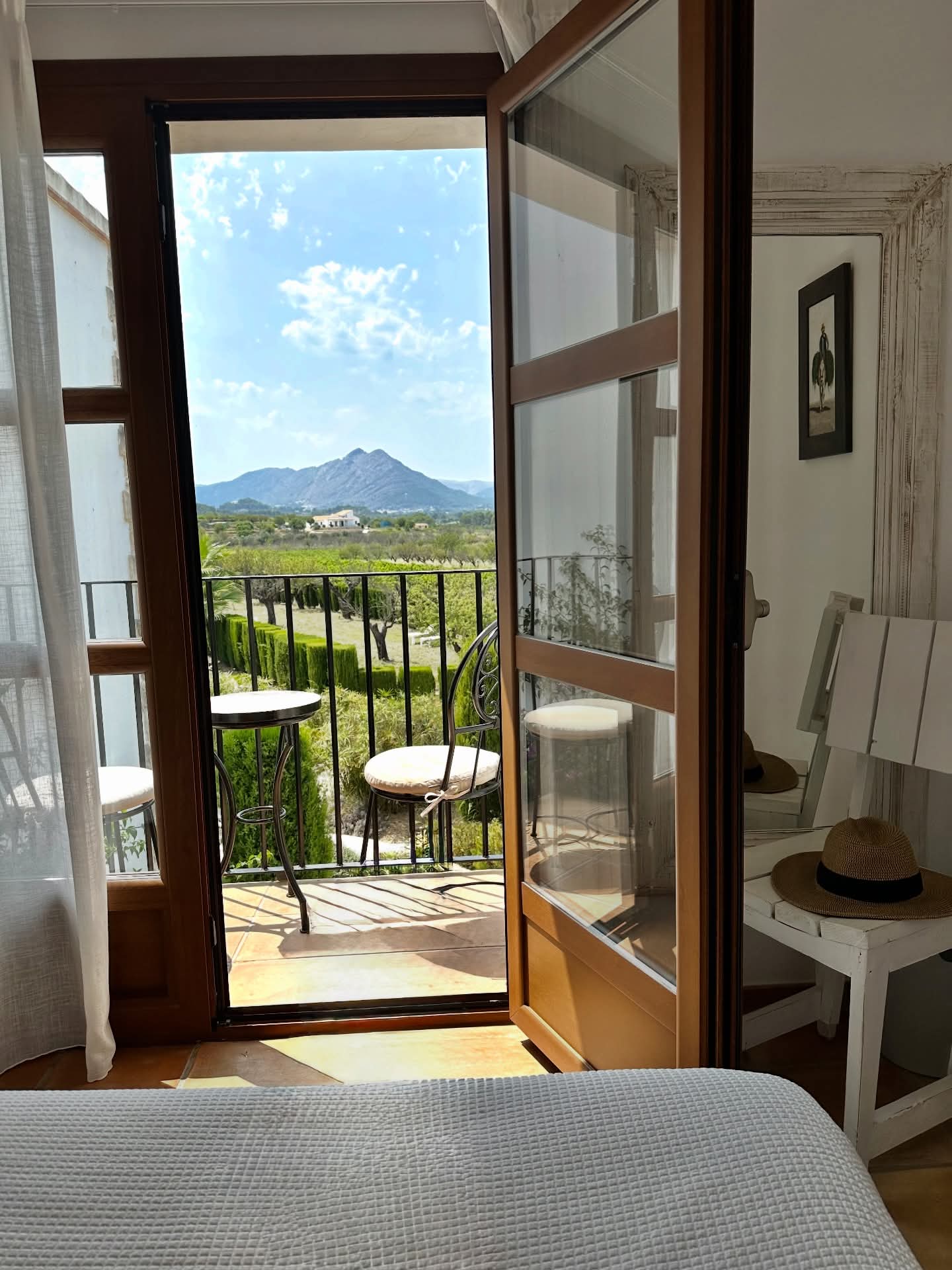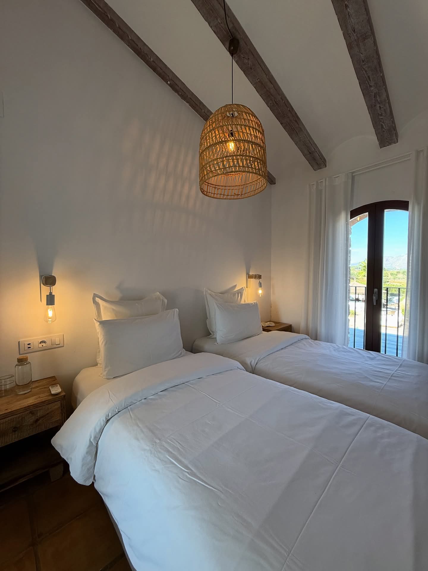 Located on the ground floor room with a private terrace each morning with stunning views of the surrounding almond trees and mountains. The room contrasts beautifully the solid stone headboard with the elegant white linens. There is AC, a wardrobe, free WiFi, hairdryer, ghds, Bluetooth speaker, sunhats and mini safe. The ensuite is fully equipped with walk-in rain shower, The White Company toiletries and plush Zara Home towels.