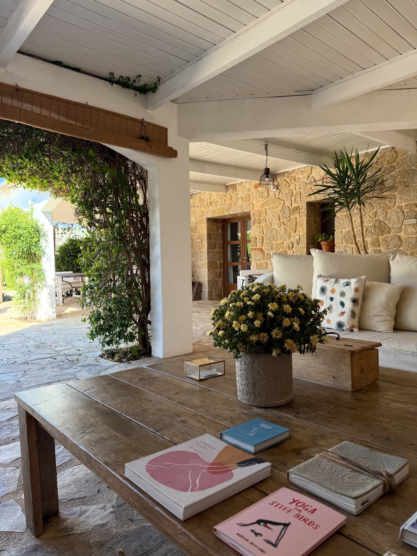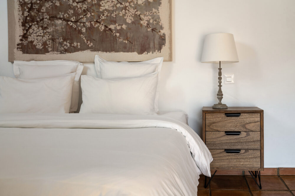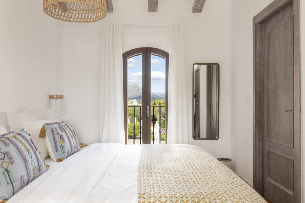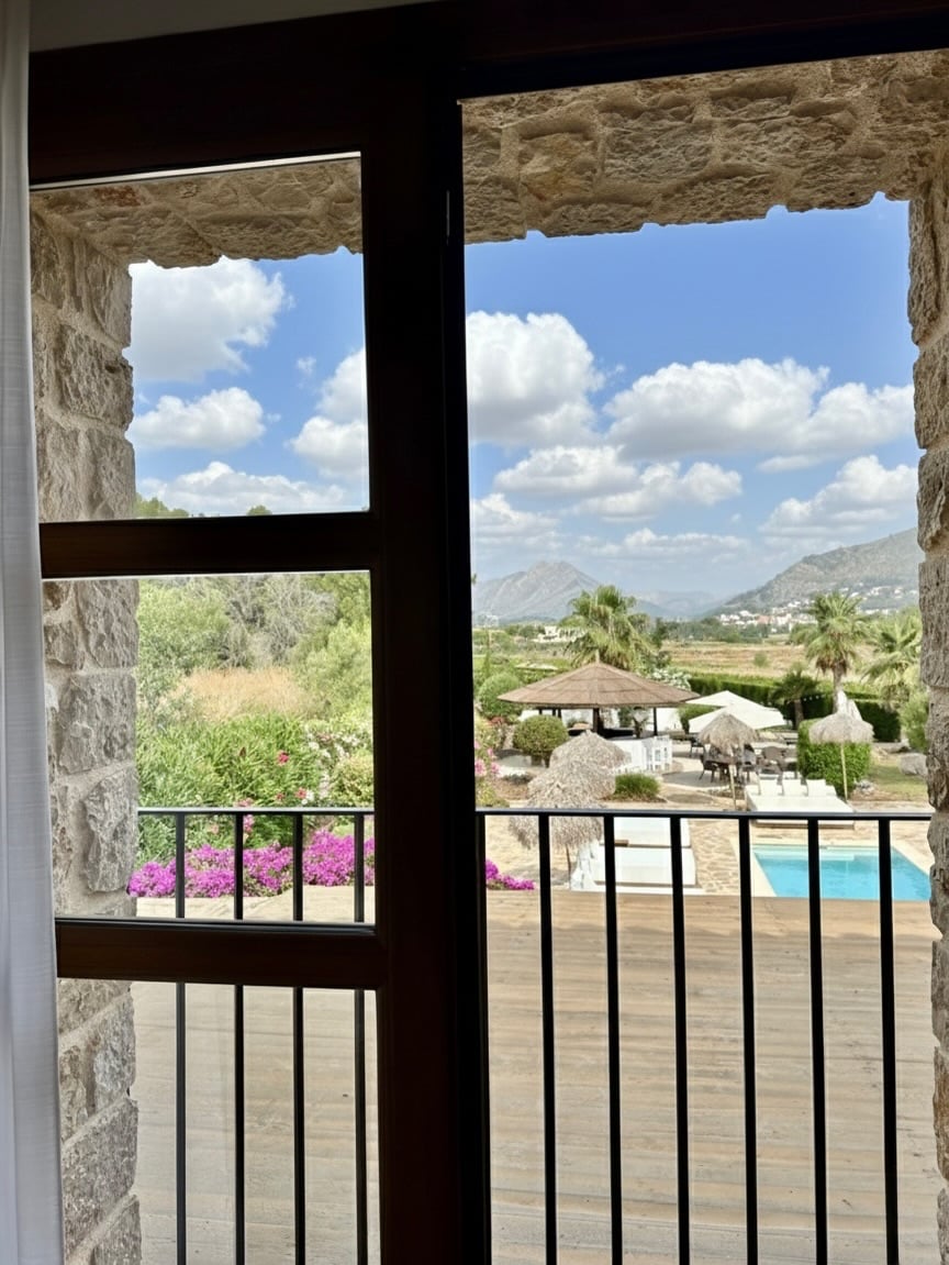 Located on the ground floor room with a private terrace each morning with stunning views of the surrounding almond trees and mountains. The room contrasts beautifully the solid stone headboard with the elegant white linens. There is AC, a wardrobe, free WiFi, hairdryer, ghds, Bluetooth speaker, sunhats and mini safe. The ensuite is fully equipped with walk-in rain shower, The White Company toiletries and plush Zara Home towels.