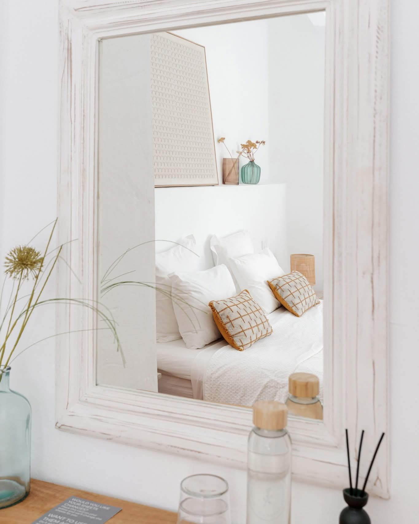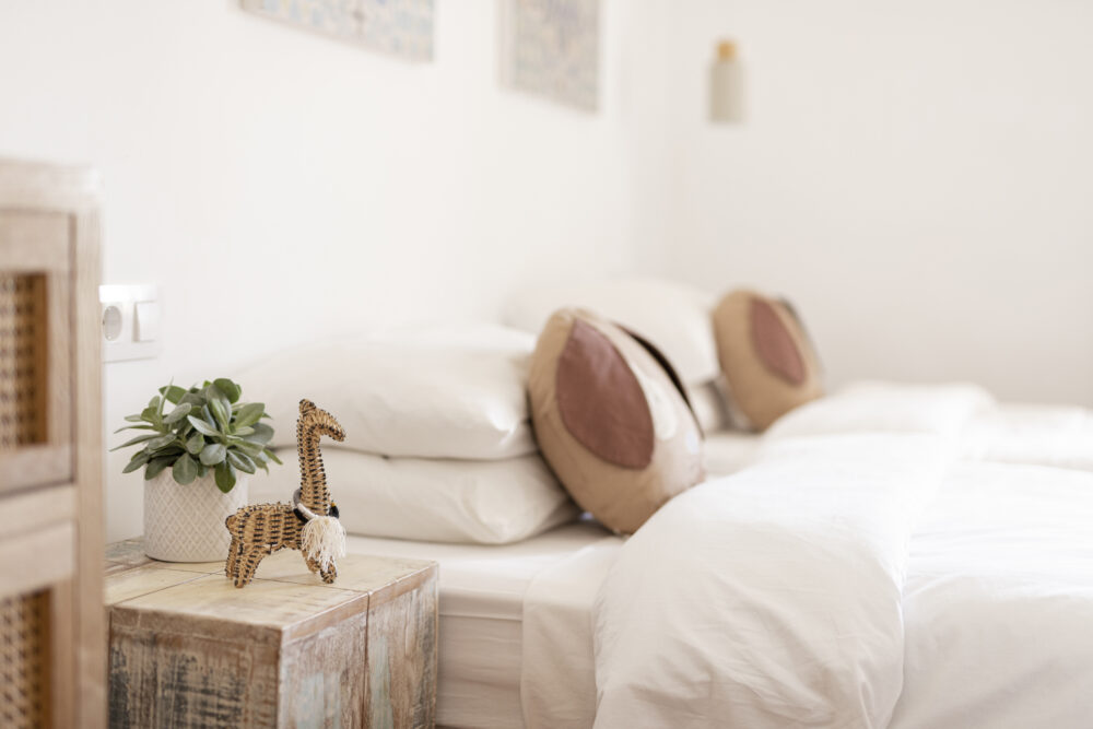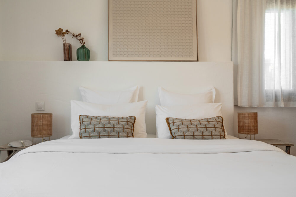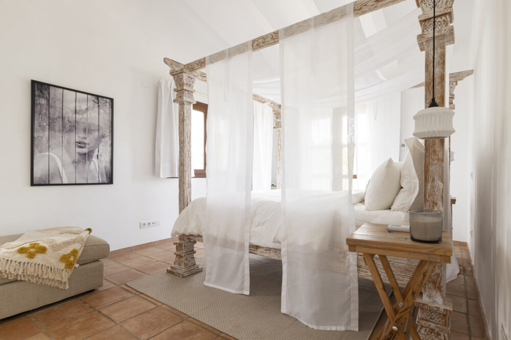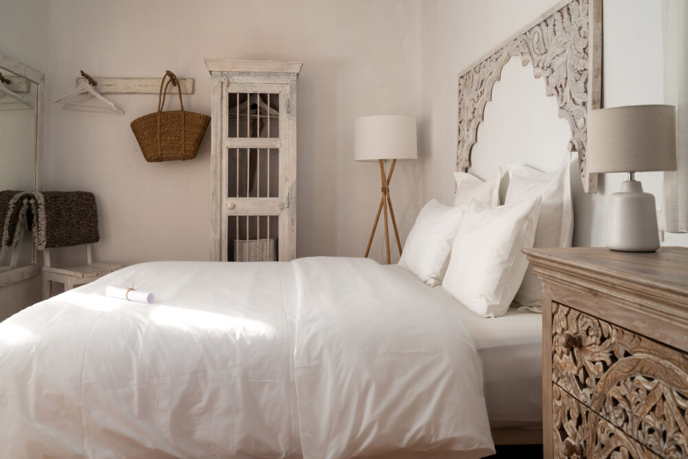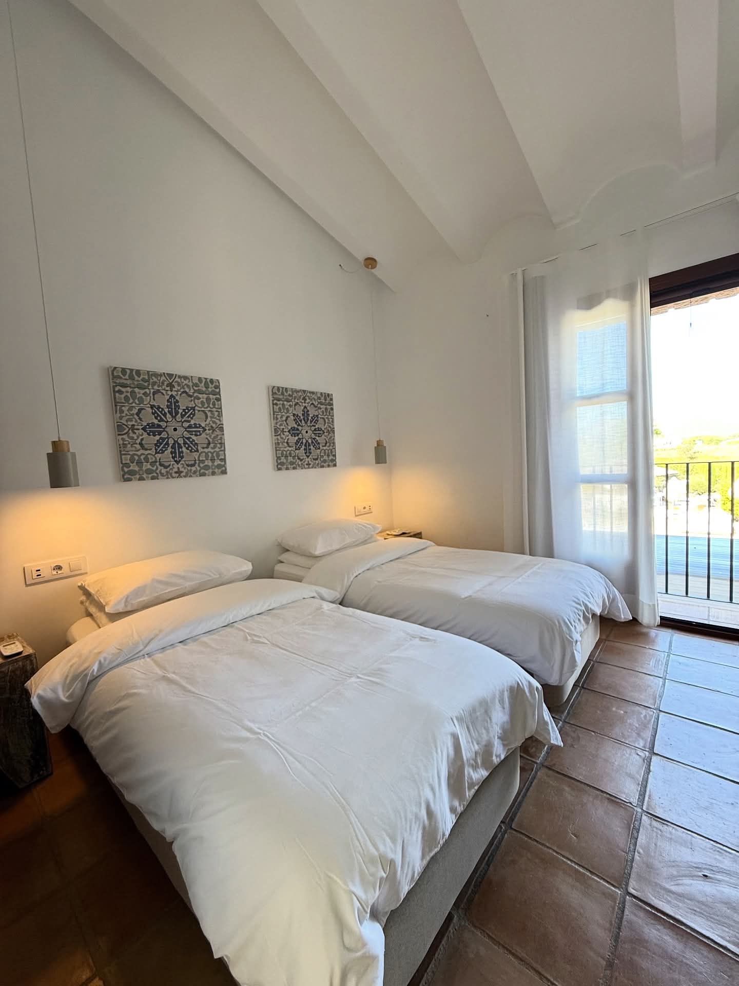 Designed with a rustic wood headboard contrasting elegantly with the lovely white linens. Located on the first floor with the best views and little balcony to enjoy watching the sunset. There is AC, an open wardrobe with wooden chest, free WiFi, hairdryer, Bluetooth speaker, sun hats and mini safe. The ensuite is fully equipped with corner shower and plush Zara Home towels.