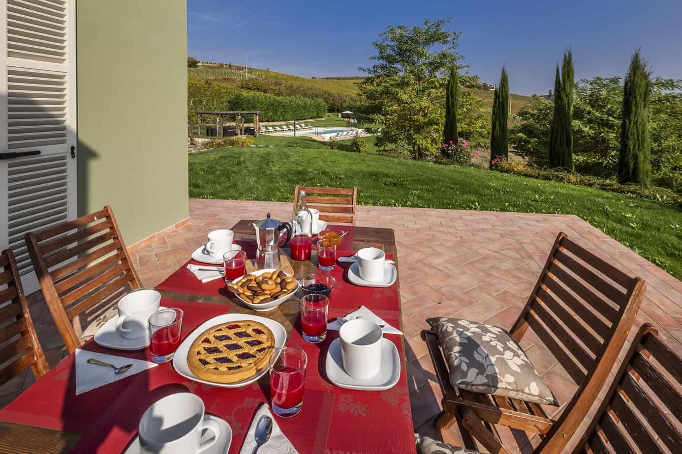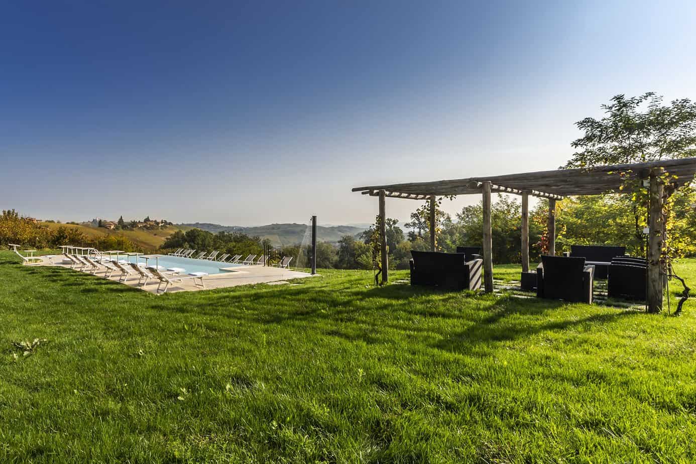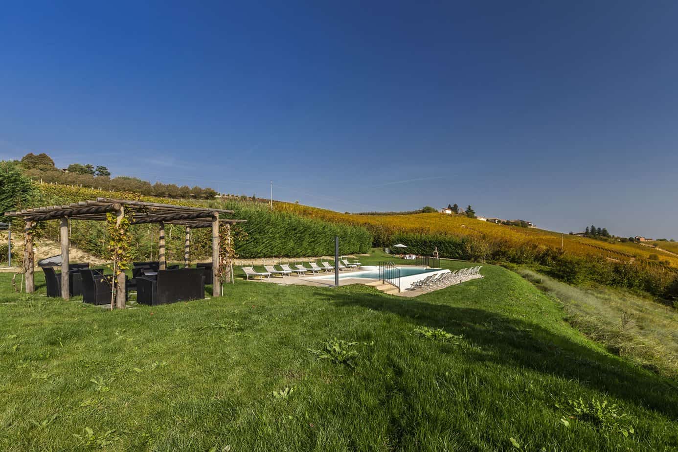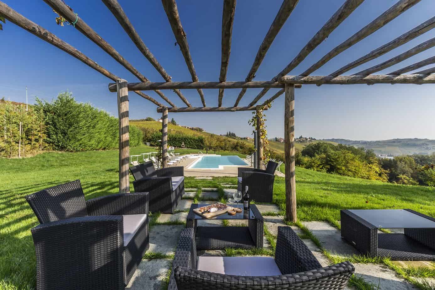On the south side lies the heated swimming pool and between it and the house is a beautiful pergola organised as an outdoor living area, the ideal place to enjoy the sunset over the Piedmontese hills. Close to the house is a paved terrace furnished with table and chairs for excellent outdoor meals.