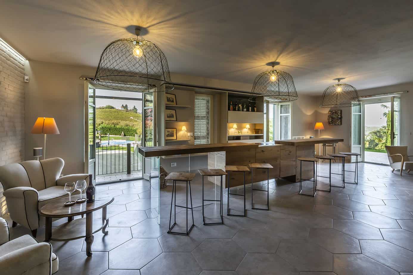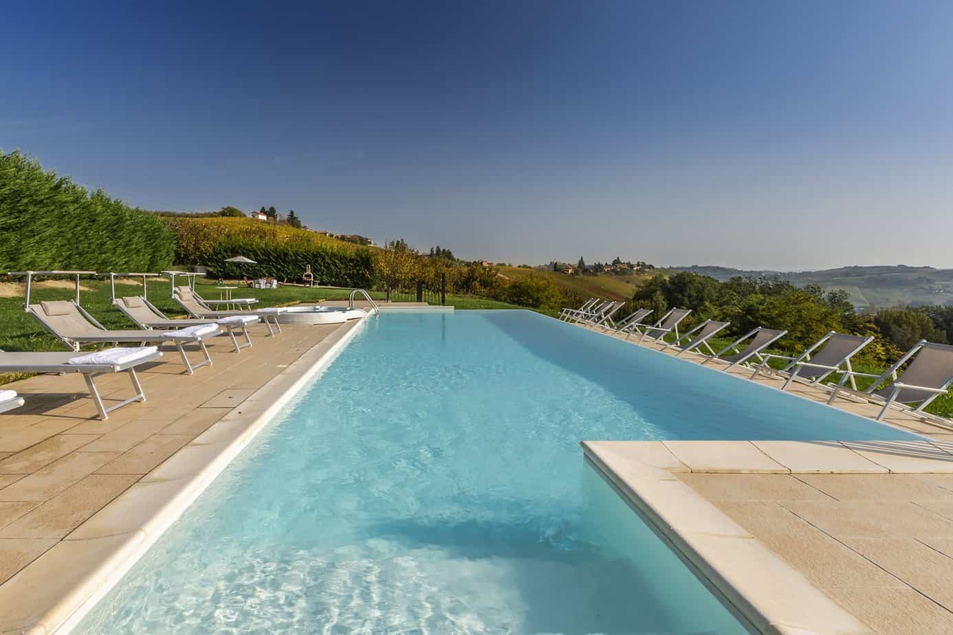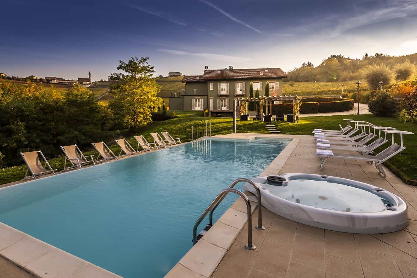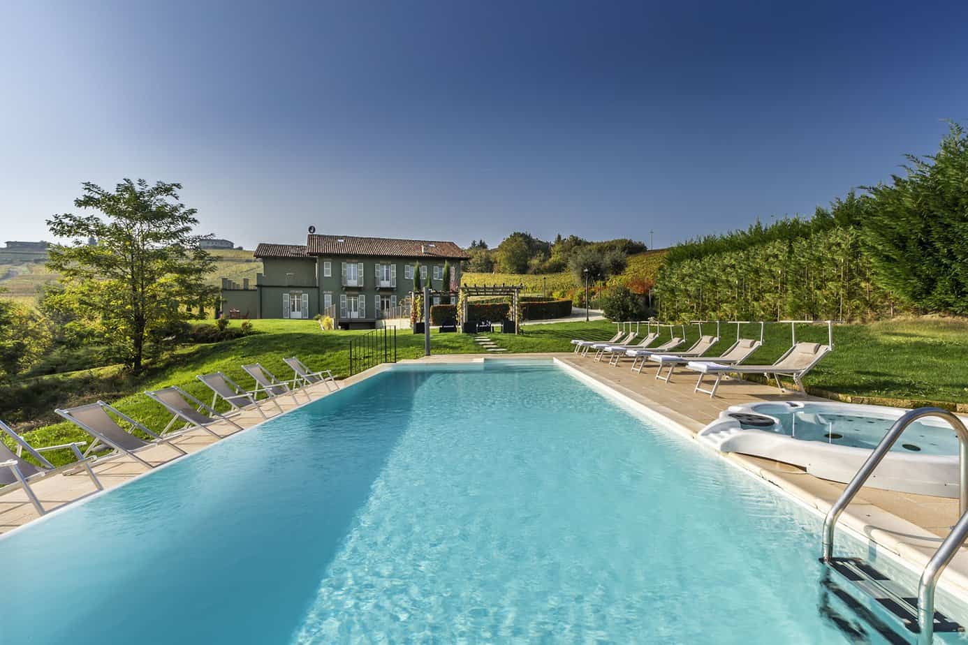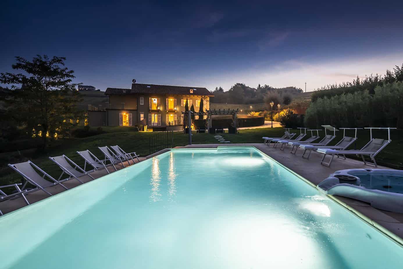 On the south side lies the heated swimming pool and between it and the house is a beautiful pergola organised as an outdoor living area, the ideal place to enjoy the sunset over the Piedmontese hills. Close to the house is a paved terrace furnished with table and chairs for excellent outdoor meals.