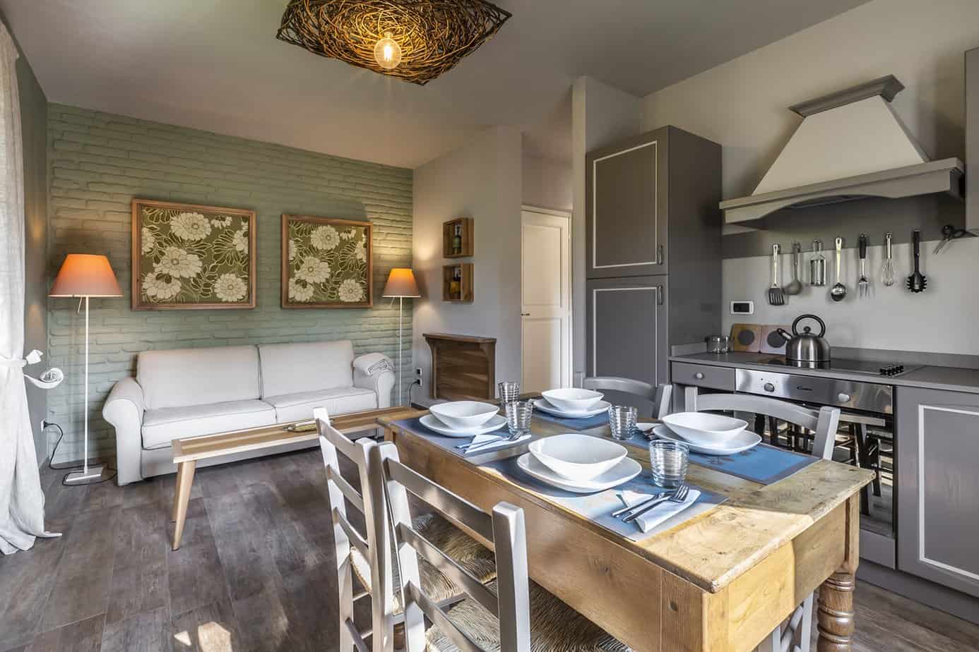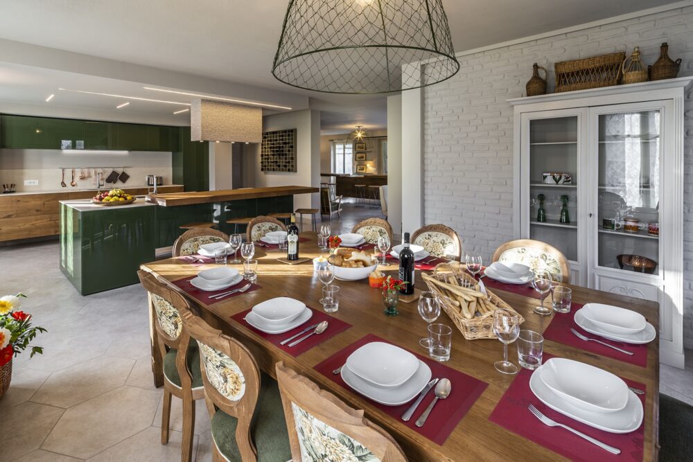 On the ground floor, the large open-plan area, divided into lounge with bar corner, dining room and a beautiful Italian-style kitchen.