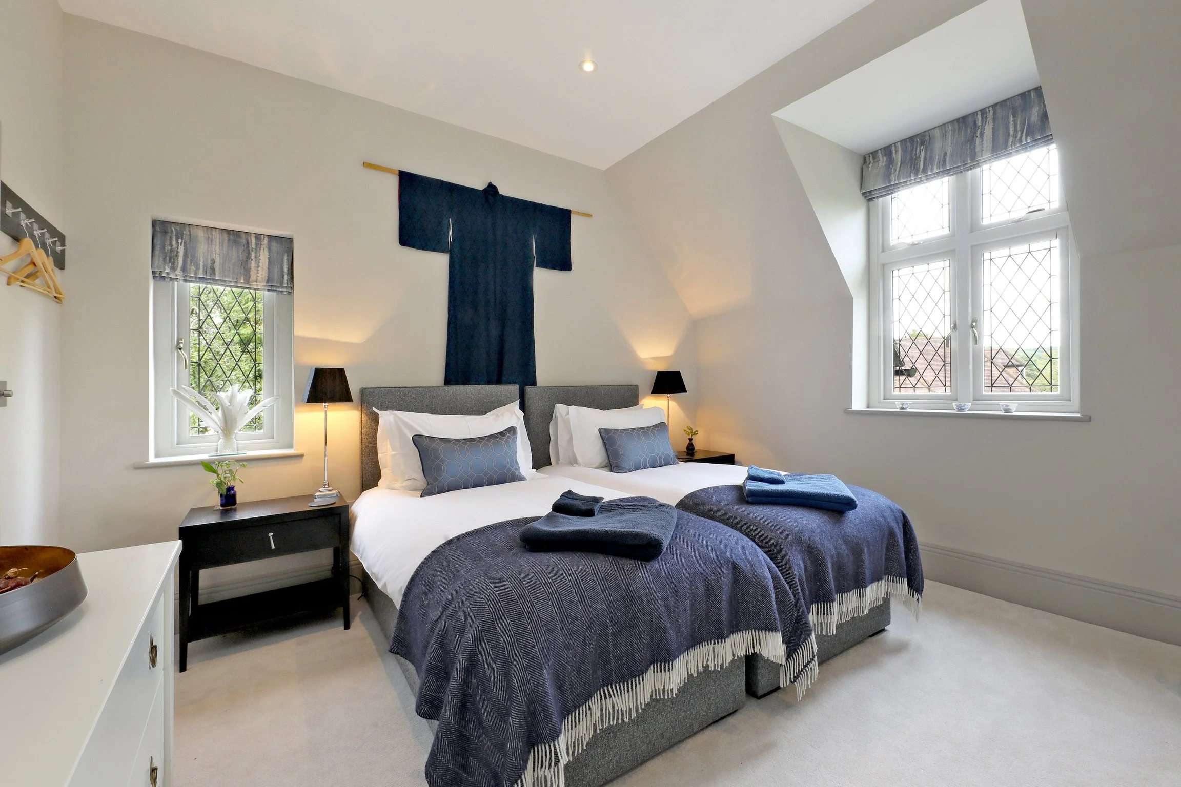 Kingfisher - A bright, double-aspect room with 2 single beds and access to the shared main bathroom with both shower and bath. A third single bed can be added if Peacock and Kestrel are single occupancy.