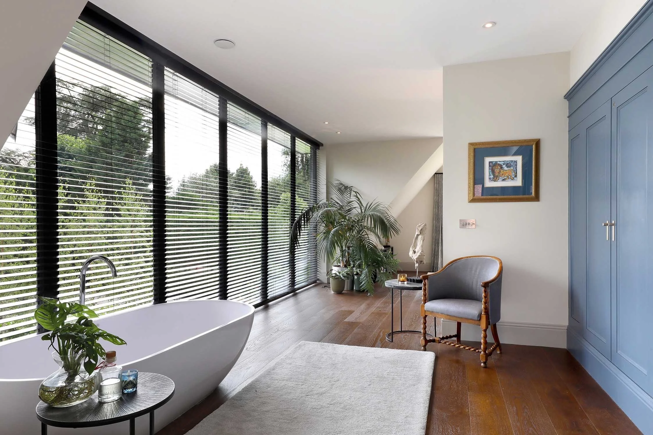 The River Suite - This is the principal suite, adjacent to the idyllic roof terrace and with stunning views down the garden to the river. It is over 700 square feet, has a superking size French bed, a freestanding stone bath and a luxurious ensuite with a two-person shower. 2 additional beds can be added to this room, if Peacock and Kestrel are single occupancy.