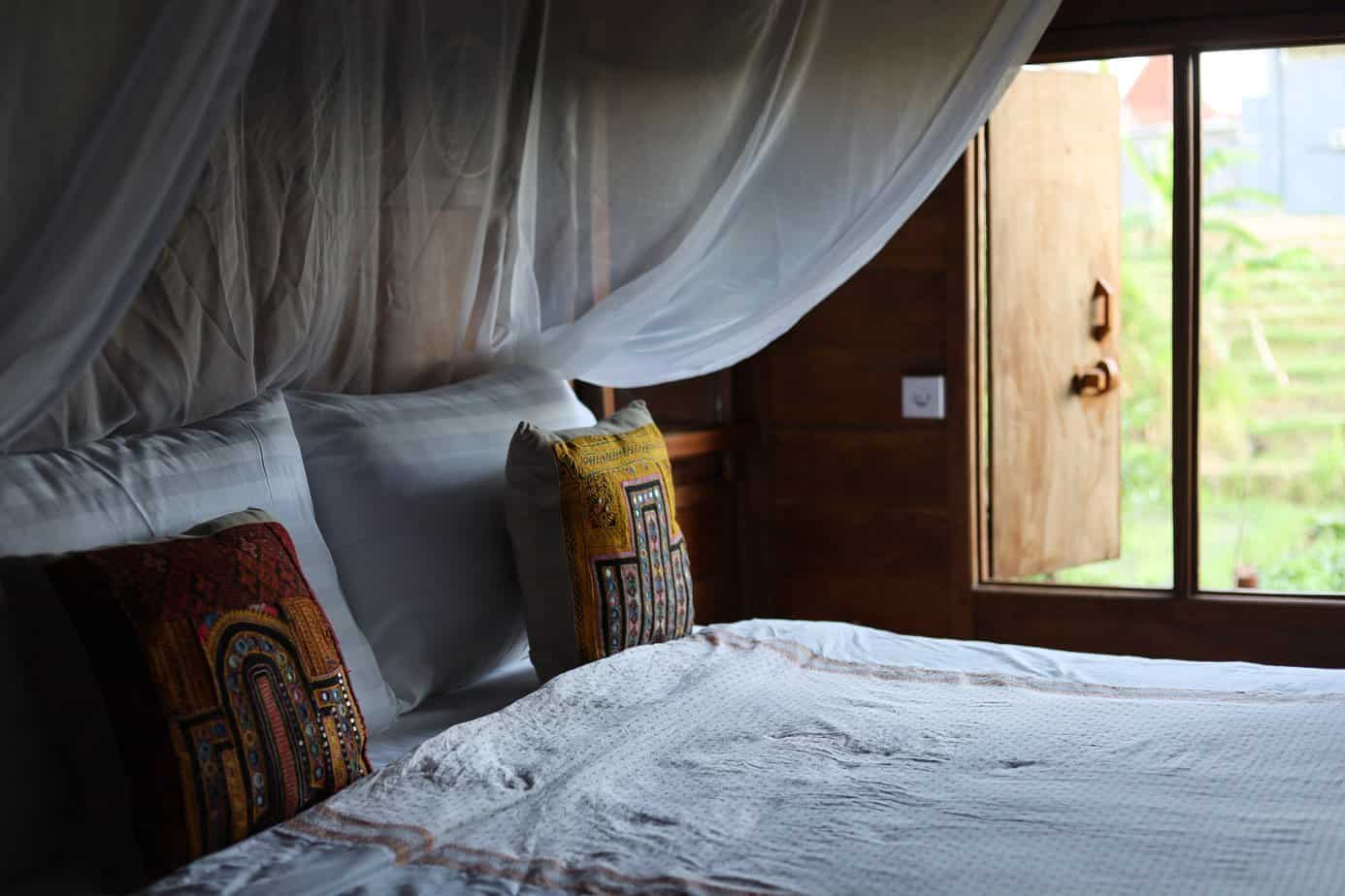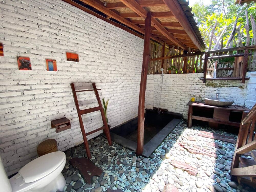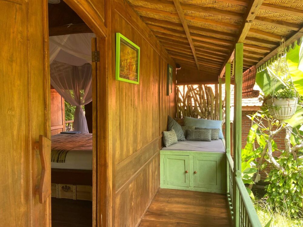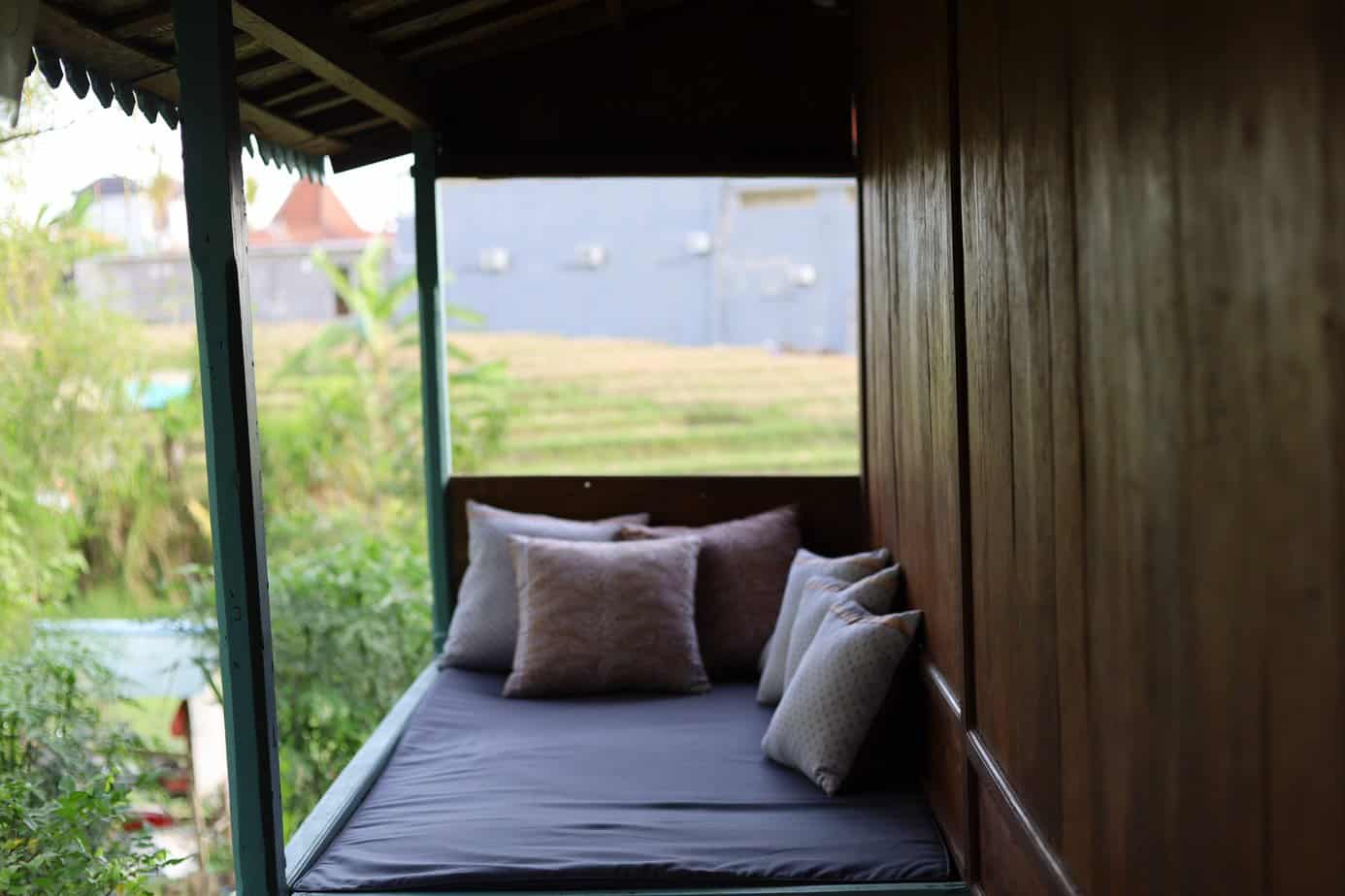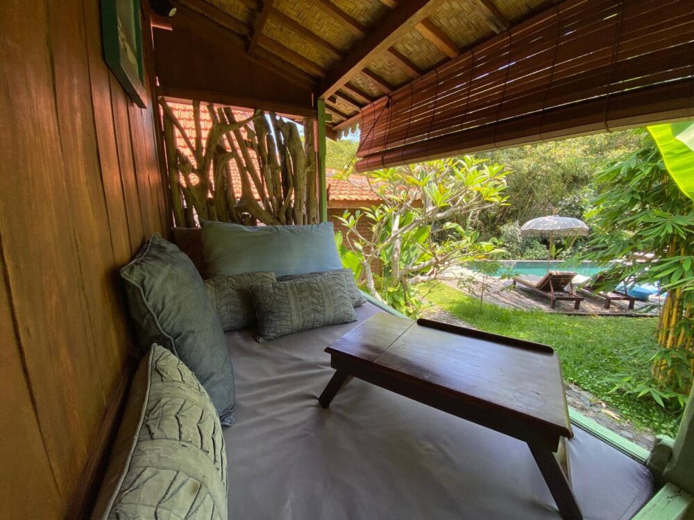 The seven independent little houses, each with a private bathroom, are set amongst a lush, serene, 3500 m2 permaculture garden overlooking the signature view of Bali, the rice paddies, a bamboo forest and a river.
