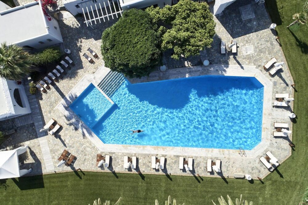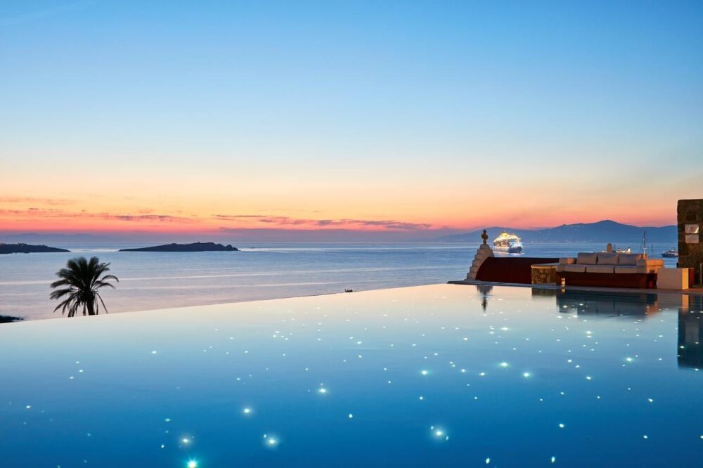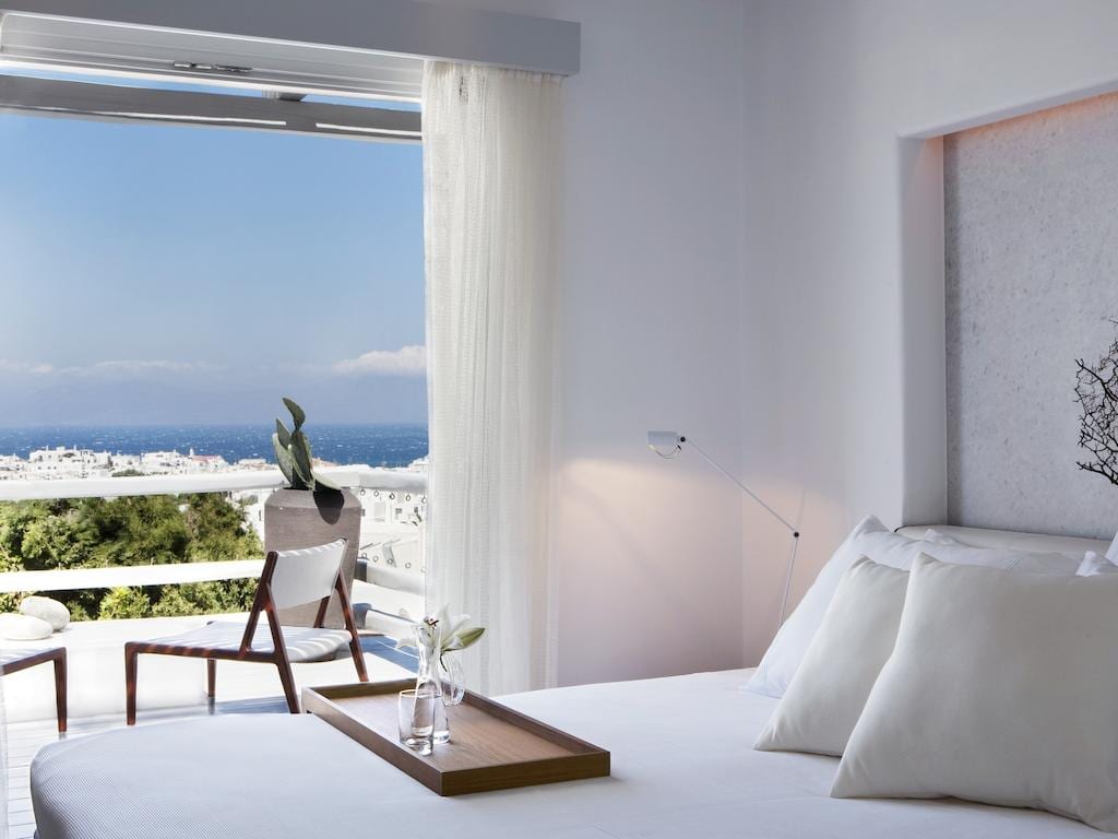 This chic hotel in Mykonos’ Chora offers a magnificent swimming pool with sunset views, a 24-hour state-of-the-art gym, gourmet restaurant and airy rooms with beautiful sea views.